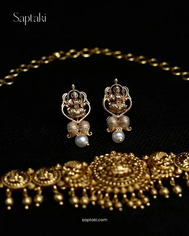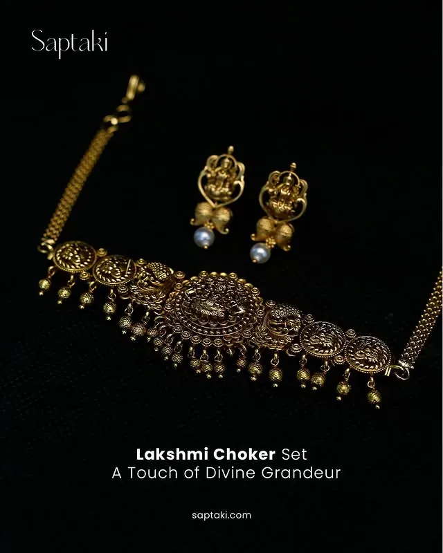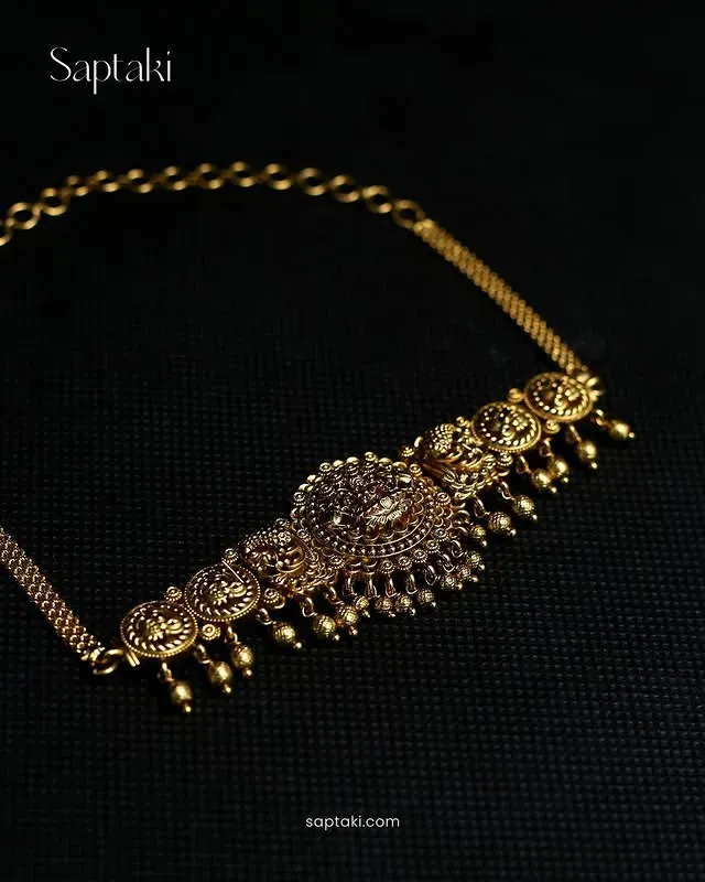Antique gold finished temple designer real gold inspired 3D goddess Lakshmi with Goldballs designed choker